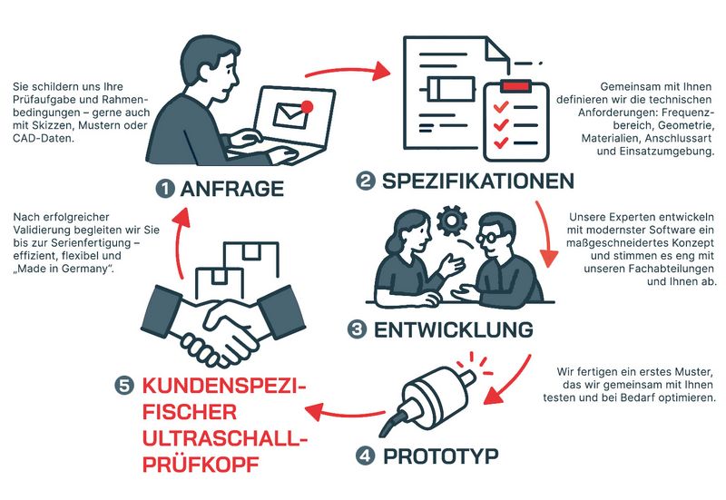 Damit Sie genau den Prüfkopf erhalten, den Ihre Anwendung erfordert, arbeiten wir nach einem strukturierten und transparenten Ablauf: